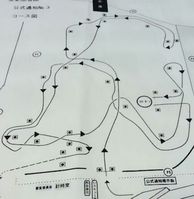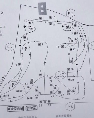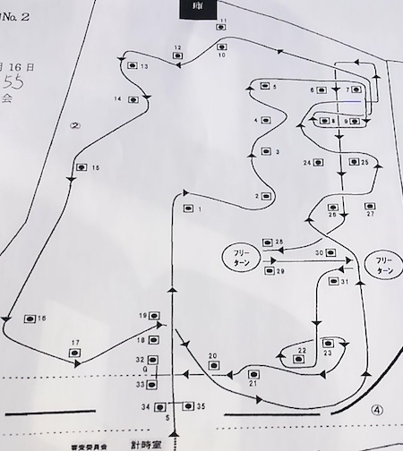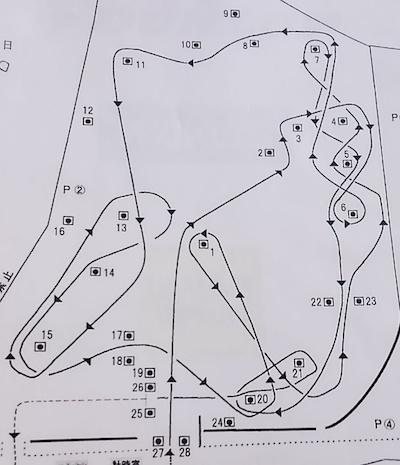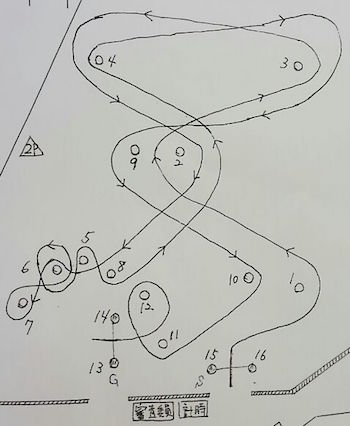 5番の向きを変えるパイロンでモタモタしないこと、4-7-8のシケインくねくねはリズムよく、踏んでいって17-18を巻いて戻ってきますが戻りの10-11の間を通る所でMCしないでね。