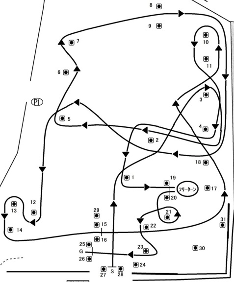 右か左かでフリーターンの回り方を選択し、20パイロンからちょっとひしゃげた定常円回りみたいに走って23-24とひっかけて向きを変えたら再び踏む。